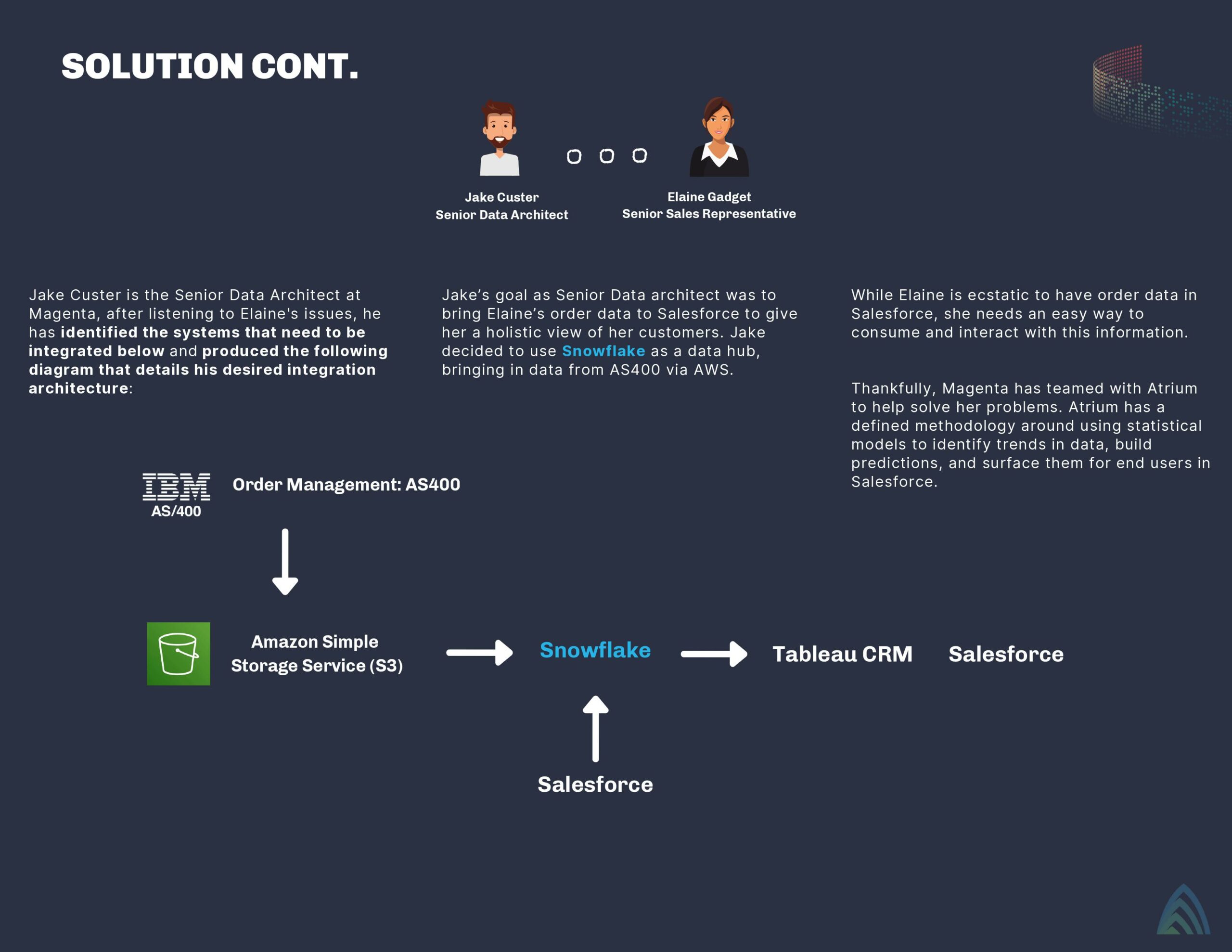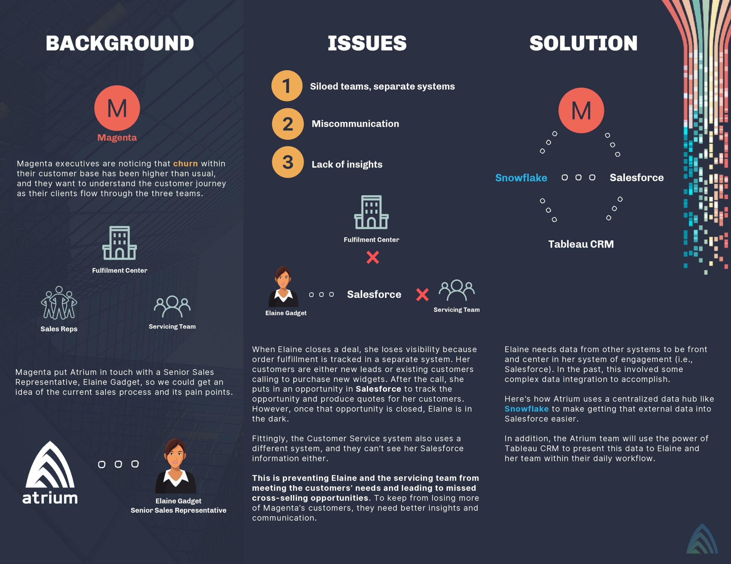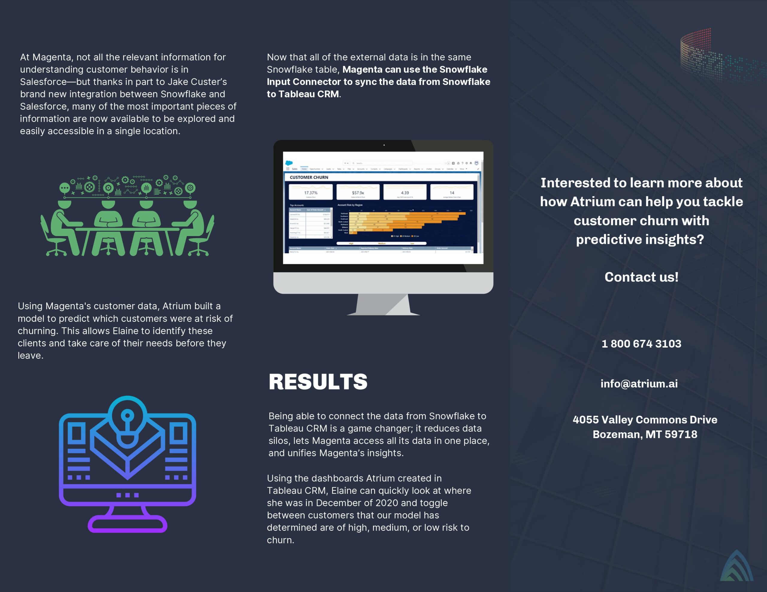 Magenta put us in touch with a Senior Sales Representative (let’s call her Elaine Gadget) so we could get an idea of the current sales process and its pain points. Elaine said she could not stop thinking about the recent churn, and her inability to pinpoint the cause was making her restless. She gave us a peek into her daily routine, as well as the customer journey, so we could help her identify the problems. Review the infographic below to dive deeper into how we helped Magenta rethink customer churn and mitigate their risk using Snowflake.