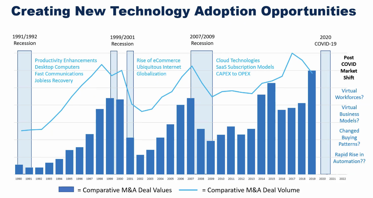 As Gartner captures above, each major cycle over the last 30 years brought significant productivity growth and innovation whether that relates to the movement to Client-Server in the 90s, broad availability of the internet in the 2000s, or the emergence of cloud computing after 2008. What will those innovation themes look like with COVID-19 over the short and medium-term? Many answers are already in front of us. As our team has observed our customer base, we are already seeing Gartner’s themes play out over a compressed timeline related to remote working environments, business models virtualizing, and customer demand patterns shifting. It’s a lot to process and that can lead to paralysis.