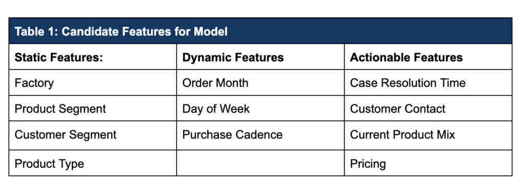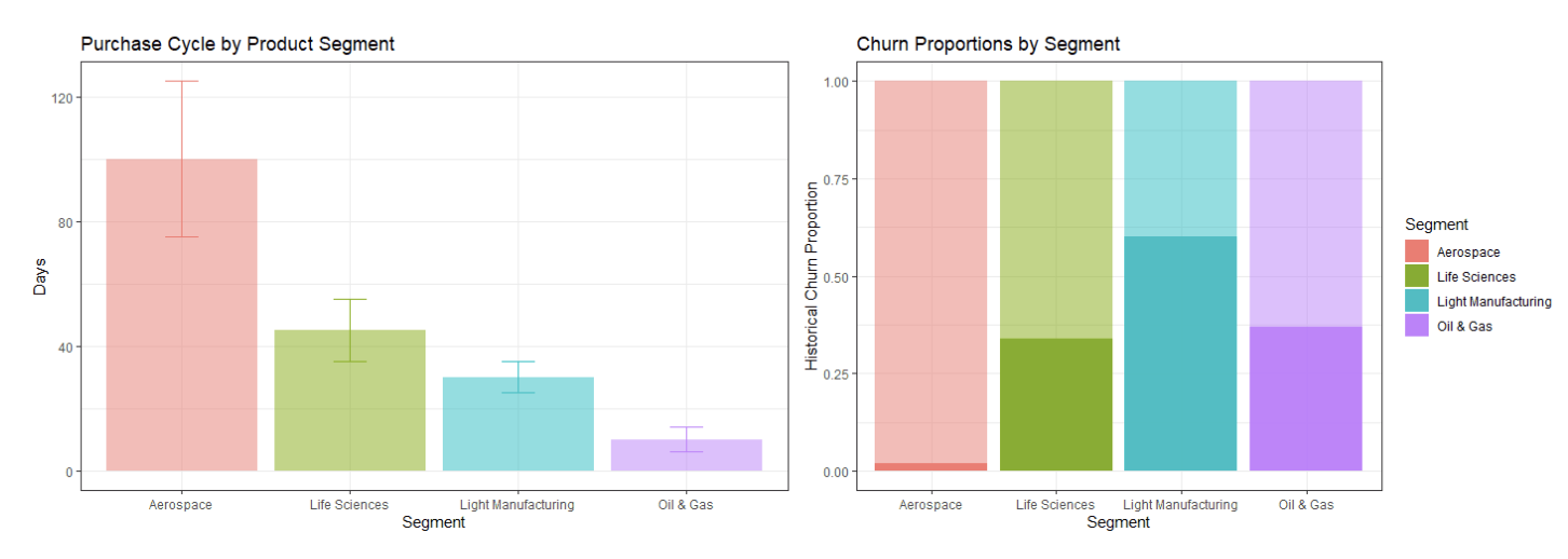 A pattern quickly emerges: customer order cadences are quite different across the different product segments, and churn rates vary substantially as well, as shown in Figure 2. Additionally, we see a counter-intuitive relationship between purchase cycles and churn rates; in Oil and Gas, for instance, churn rates are near 40% with purchase cycles of fewer than 10 days. These differences could provide useful information in generating accurate predictions.