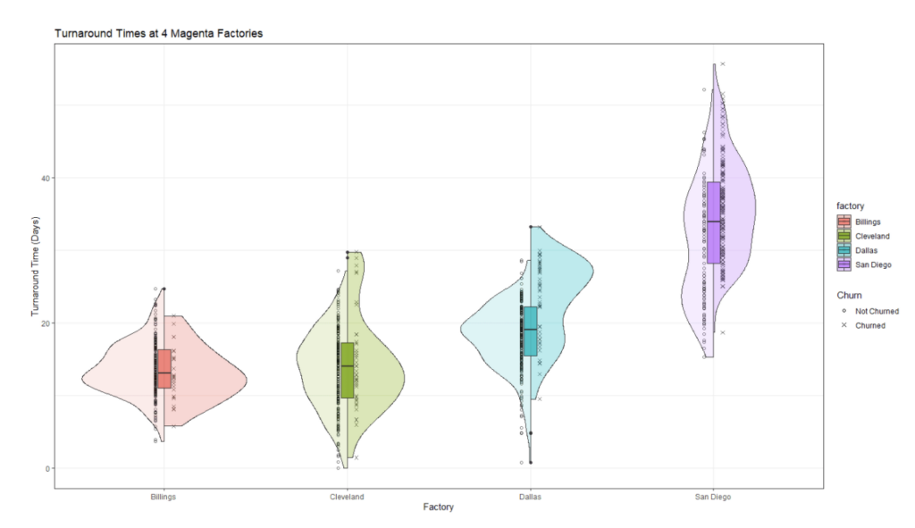 After meetings with Magenta’s subject matter experts, Atrium’s consultants hear feedback that Magenta also experiences variability based on geographic location. Because of the way that Magenta has grown as a company, its four different factories operate relatively autonomously. By exploring this hypothesis with a little more in-depth analysis, Atrium’s consultants quickly identify that the San Diego widget factory has higher median turnaround times than any other factory: almost 20 days more than their Billings location, as shown in Figure 3. All of this can lead to higher churn rates, particularly for customers who interact with the San Diego location. By leveraging client expertise to drive a pointed analysis of the data, they have found an important predictor to consider in the model.