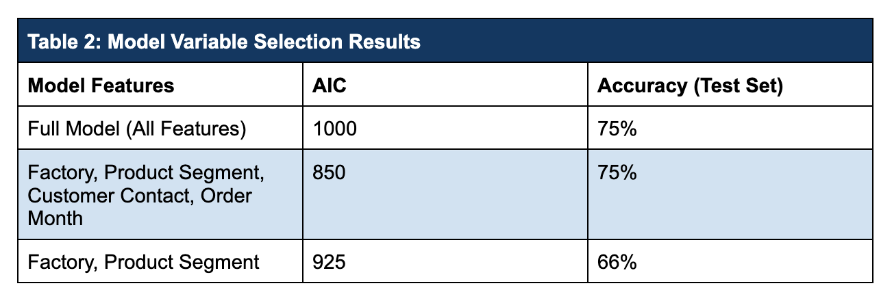 Atrium’s data science team fit multiple models and compared them. The full model with all features considered and a reduced model with only 4 features both predict with 75% accuracy. Based on AIC (smaller is better), the 4-variable model is selected as optimal.