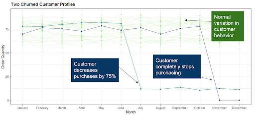 A critical first step in building a churn model is to define exactly what it means for a customer to churn. Defining customer churn is not always easy. In some cases, the picture is black and white: a customer simply stops transacting, or transfers their business to a competitor. However, customer churn doesn’t have to be so narrowly defined. As Elaine looks at her customers in Salesforce, she realizes that some of them have not completely stopped purchasing, but are buying 75% fewer widgets than they had been previously purchasing. In some cases, they’ve stopped purchasing entirely; both types of churners are causing problems for Magenta’s bottom line. Figure 1 shows a sample of customer profiles for regular customers, a customer who completely stopped buying, and one who drastically reduced their spend.