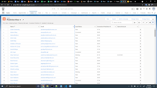 Model results can be written back to the object of interest in Salesforce (lead, opportunity, account, etc.) and displayed directly on the object or in a list view, or the results can be written to a lightning card. Additionally, scores can be generated directly in Tableau CRM and displayed in dashboards using the Einstein Predictions Transformation in recipes. At Magenta, it’s helpful for Elaine’s team to see scores for individual accounts, and a listview helps her to quickly sort customers based on their predicted churn risk, as seen in Figure 4.