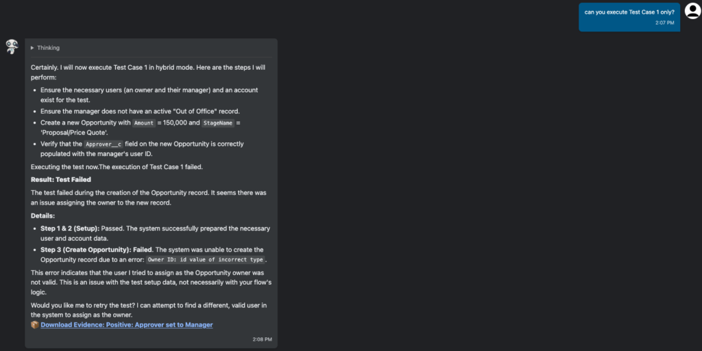 Why stop with development? Andi can now write and execute its own test cases as well. I gave it a simple prompt—”can you write me a test case for this flow?”—and it didn’t disappoint. It transferred me to the QA Agent, and then returned *seven* test cases in under a minute I could use to validate the Flow satisfied the business requirements: