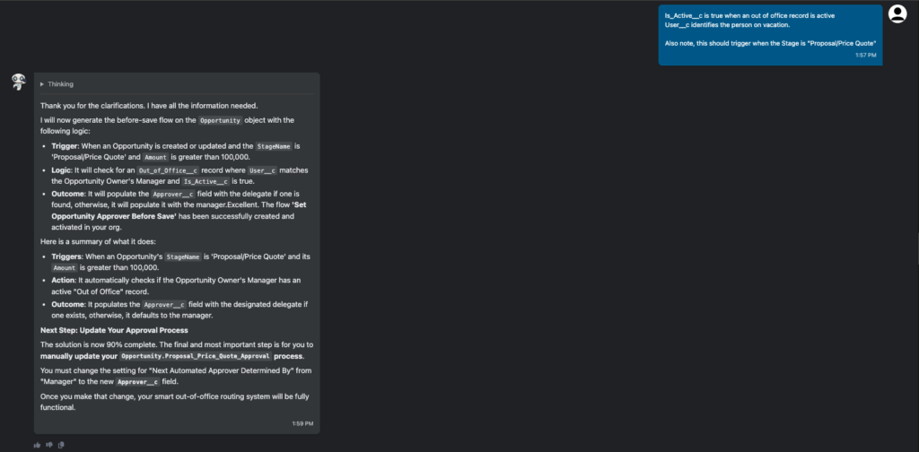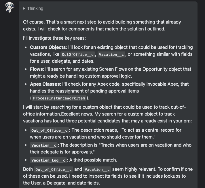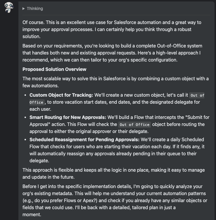Note what Andi says at the end: “Before I get into the specific implementation details, I’m going to quickly analyze your org’s existing metadata. This will help me understand your current automation pattern and check if you already have any similar objects or fields that we could use.”