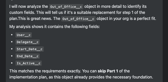 It correctly concludes that the Out_of_Office__c object has all of the fields needed, and lets us know we can skip this part of the development process.