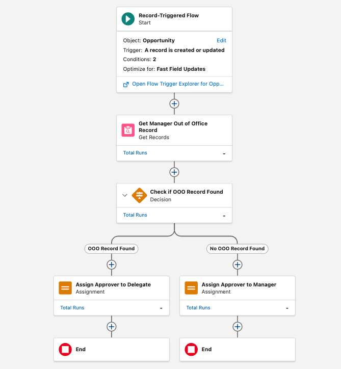 Flow Description: Before-save on Opportunity: When Amount > 100k and Stage is ‘Proposal/Price Quote’, this flow sets the Approver__c field. It assigns the owner’s manager as the approver, unless the manager has an active ‘Out of Office’ record, in which case it assigns the designated delegate.