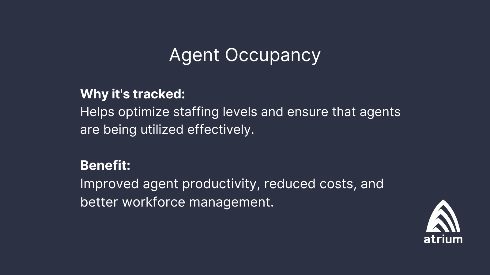 Agent occupancy measures the percentage of time agents are actively engaged in handling customer interactions. This includes talk time, hold time, and wrap-up time.