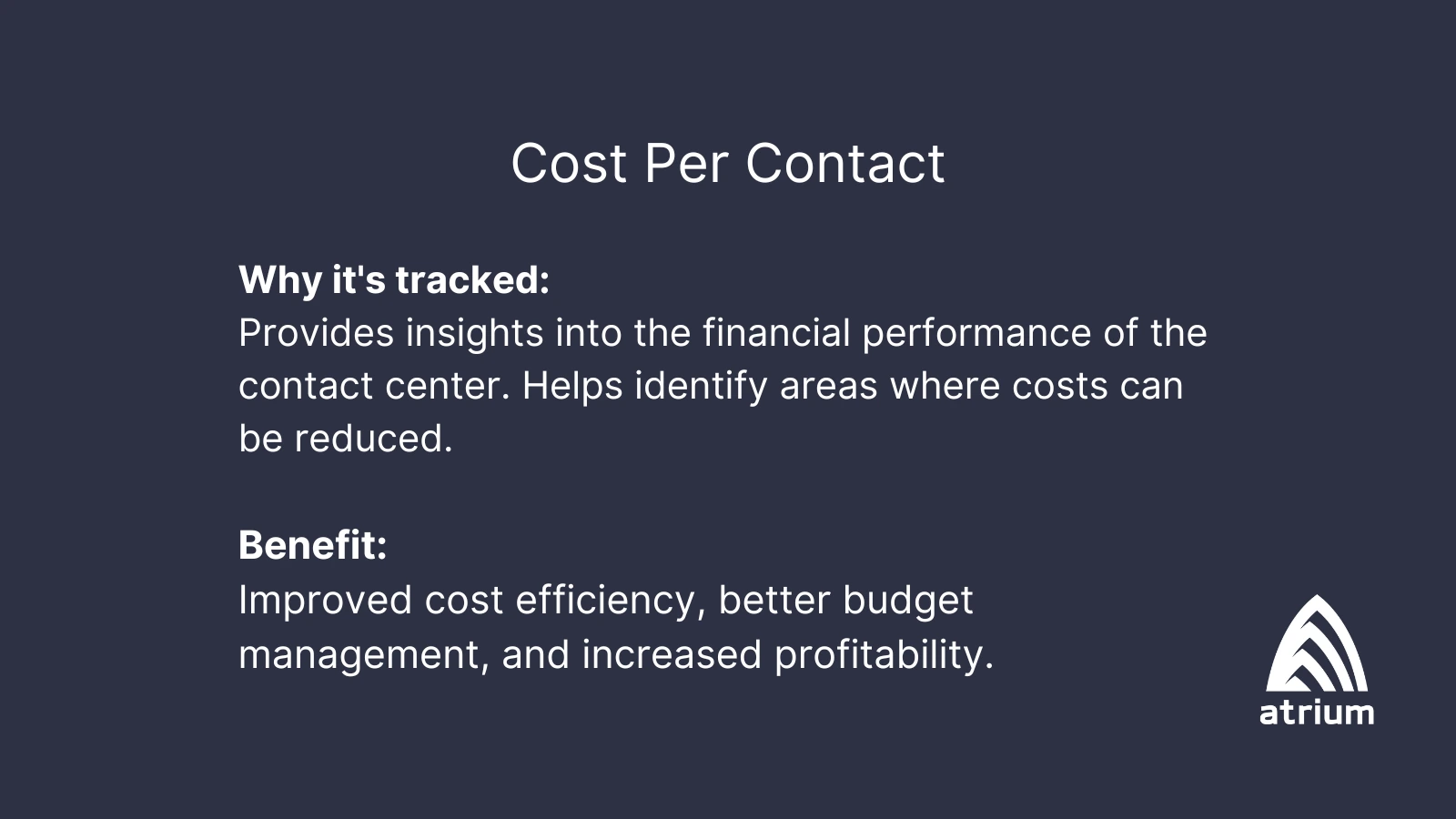 Cost per contact measures the average cost of handling a single customer interaction. This includes factors like agent salaries, technology costs, and overhead.