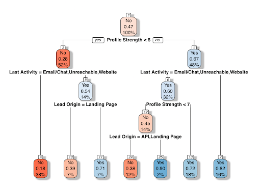 Figure 2. Example of a decision tree using this data. Each bubble gives three values: a word, a number, and a percentage. The word is the predicted outcome at that specific point, or node, in the tree. The number is the propensity score at that node. The percent is the amount of data in the training set that made it to that specific node. Below each bubble is a decision. If the logical expression is true, the record continues to the left in the tree. Once a record reaches a final point with no additional decisions, a final prediction is given.