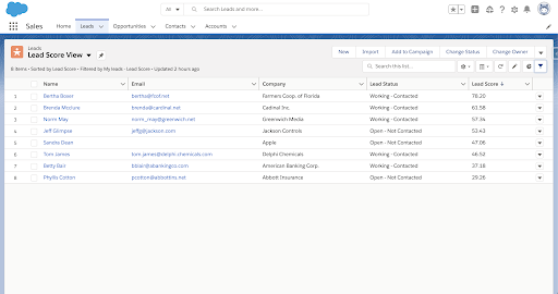 Figure 3. Example listview sorted by lead score.