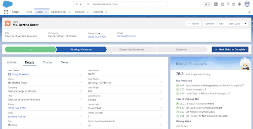I was able to provide insights to SJMSOM salespeople through sorted listviews (Figure 3) and side card views of potential drivers (Figure 4). The list view will provide a list of all student leads and sort by lead score. This will allow a salesperson to either avoid low scoring leads and focus on converting higher scoring leads, or dig into why a lead is scoring so low with the hopes of a discovery of a systematic change that could help the entire sales team. If a salesperson wants to dive into a specific record, they have the ability to drill in and gain feedback and recommendations on what is working as well as what is not for that particular student. I was able to build and deploy all of this through the power of Salesforce Einstein Discovery.