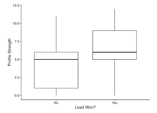 This is a great time to introduce a topic called exploratory data analysis, or EDA. EDA gives a visual representation of the data. This process is the most efficient way to quickly see potentially useful relationships at play within the dataset. For the sake of brevity, I will only display one example of EDA, but the full analysis considers all potential relationships. Of course, modeling the data is the best way to create inference from the data, but EDA provides a starting point for further analysis in model building. Figure 1 shows how much the profile strength distribution changes based on a lead being won or lost. This shows visual evidence of a relationship between Is Won? and Profile Strength. If there had been no relationship at all, the two boxplots would look like mirror images of each other.