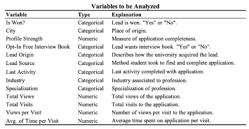 This dataset contains records about students, or leads, wishing to take a class at SJMSOM. There are 9,240 students in the collected data each with up to 49 variables pertaining to a range of details such as demographic and interest information. This course is a required course for Masters in Business Administration (MBA) students as many students (5,204) come from management or business-focused backgrounds. The goal of this dataset is to determine a lead propensity score using the variable, Is Won?. A lead for the school of management can be defined as a student who has applied for the course. The school’s sales team then targets this student and helps them through the sales process with lead stages. The student ultimately either takes the course or decides not to at some point in the sales process; therefore, the student is either “won” or “lost”, hence, “Is Won?” This data will be used to create a model for new lead propensity scoring.