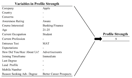 Missingness of data is a major problem in this data. Only 21 variables have less than 20% of missing values. Even worse, 18 variables have more than 60% of data missing. I engineered a profile strength variable to retain some information from 16 of the variables, while I dropped other columns completely. The new profile strength variable is a way of scoring a student’s application on completeness. If a student did not care to take the time to properly complete the application for the class, my hypothesis is the lead will convert less frequently than a more complete application. For a single record, a complete application would receive a 16 (one point for each completed part of the application) while an application with nothing filled out would receive a score of zero. Table 1 shows an example of a calculation for profile strength.