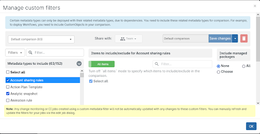 If, on the fly, you want to select or deselect any particular metadata, you can do that irrespective of the saved metadata set you are already using. There is an option to include any managed package metadata in the comparison. This helps to compare only the relevant metadata, thus less time consuming in comparison.