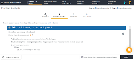 The UI is very friendly and looks like Salesforce Changeset where you can select the different metadata from the list based on the type of feature or the metadata functional unit you want to successfully deploy. Once these are selected, these will be again analyzed further by the tool for all dependencies and warn users about any dependency that needs to be taken care of. Users can proactively go though these dependencies and can go back to select/deselect any additional metadata. This prevents the failing of validation or deployment process which comes as the next step.