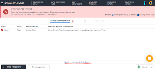 Users can select any of the 2 options: validate or deploy. Sometimes validation needs to be done against another specific branch of the repo, so the validation button can be used. In case the validation or deployment error occurs, this is shown in red as the header and there is a direct link to the org deployment settings page.