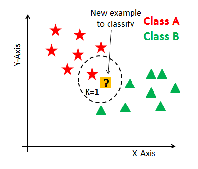 It is a non-parametric classifier as the entire training set are the model parameters. Let us take a pictorial view to understand the concept clearly. In the diagram attached below we can see two types of objects, one having the shape of a star and the other one is triangular. There is one object which is square in shape and is denoted by “New example to classify.” This algorithm finds the distance between each and every training example with the “New example to classify” and returns the label of the nearest one. So, the label of the test example is defined as the label of the training example nearest to the test example.