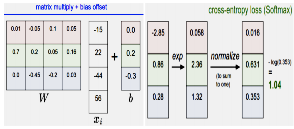 Loss function measures how compatible the given set of parameters with respect to ground truth value. Unlike SVM classifiers which use hinge loss, it works on cross entropy loss.