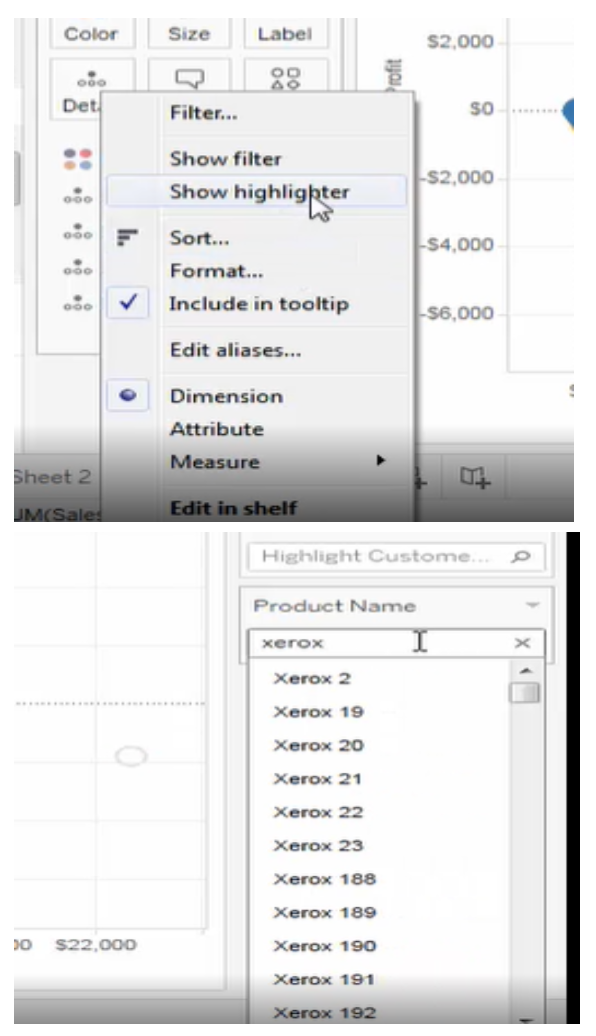 This is very useful when there are large amounts of data. This can enable us to search for data points in a view using keywords or select from a drop-down list. It can also highlight the specific data point while keeping the context of the other data points. Additionally, we can use it for ad hoc comparisons to help spot insights. This can be used across dashboards, actions, worksheets, and filters. So, this can highlight on color, size, or shape. It lets us quickly search and visually locate desirable data and without changing the context of the data.