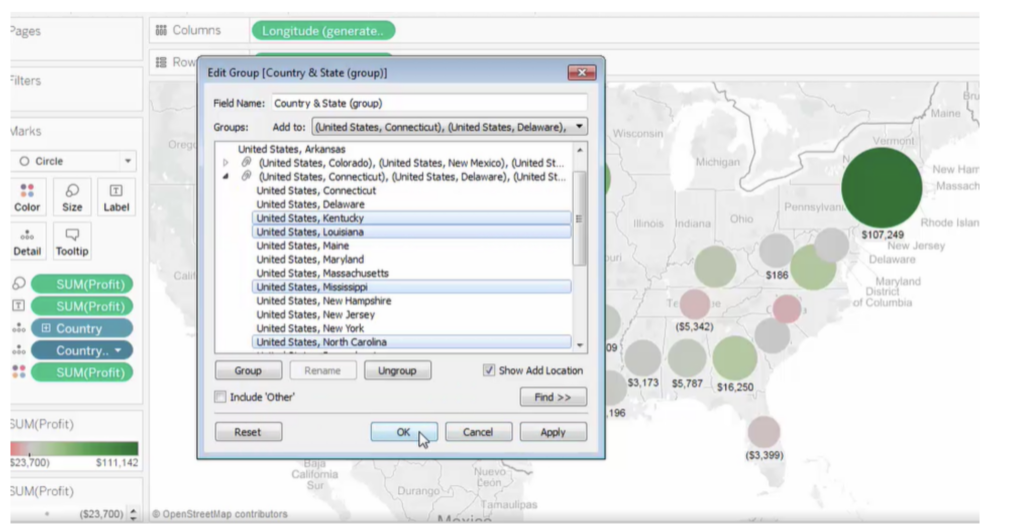 To make this simpler, Tableau has created a tool with which we can easily aggregate geographies to build our own custom territories. Now there are several ways to create territories such as select and group locations on a map, create a territory from a geographic field, and geocode a territory field using another geographic field. If our data source doesn’t contain a territory field at all, we can blend a territory field with another geographic field in our data source.