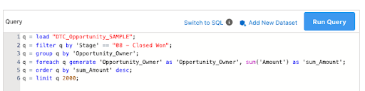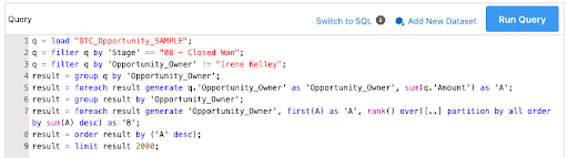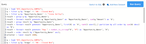 Hop over to the SAQL, and see what we’ve created. You’ll see that because we used the windowing function “Rank,” Tableau CRM needed to group twice, which allowed the rank function to perform calculations on the grouped rows.