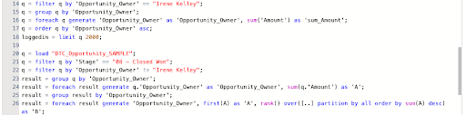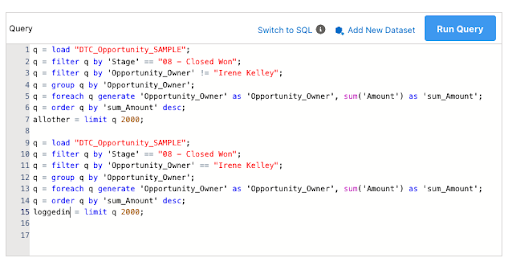 The first stream will include all owners except the logged-in user, while the second will include only the logged-in user. If you’ve already spent some time in Tableau CRM, you’ll know when we need to combine two different data streams we’re going to have to hop into some code! Let’s enter the SAQL. Your code should look like this: