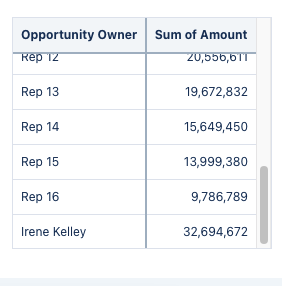 This function will allow us to anonymize the names of the individual reps, while keeping the value of the amount sold. Your output should look something like this: