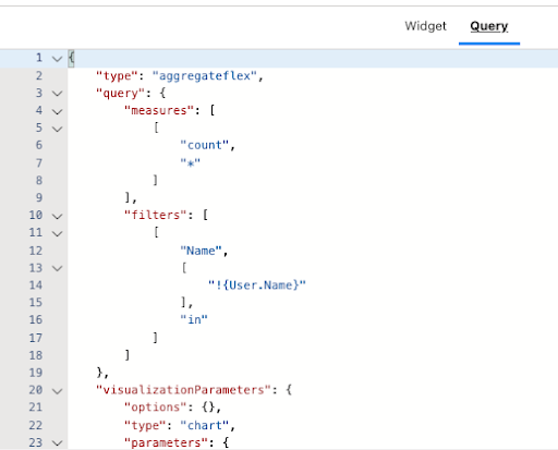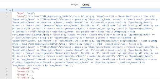 Right now, our query is trying to tell TCRM to filter the dashboard to only see Irene Kelley’s information. We need to make this dynamic! To do this, we need to dive into the advanced editor for that Salesforce Direct Query we just created. Click once on your query and select “Advanced Editor” in the top-right corner. Switch front the “Widget Tab” to the “Query Tab.” Find Irene’s name and replace it with “!{User.Name}”. This function will tell Tableau CRM to only look at the logged-in user when viewing this dashboard. Here’s a view of that modified Salesforce Direct Query:
