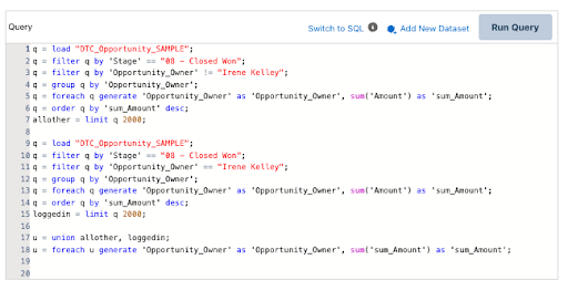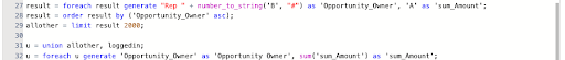 Unions are simple. All we need to do is tell Tableau CRM to union the two datastreams (line 17 below) and then use a generate statement to output the two fields we need — Opportunity Owner and Sum of Amount (line 18 below).