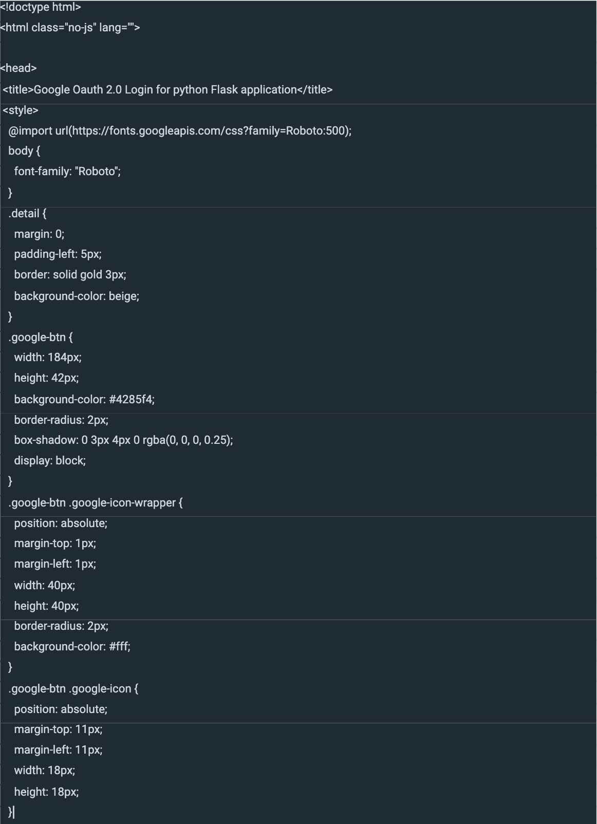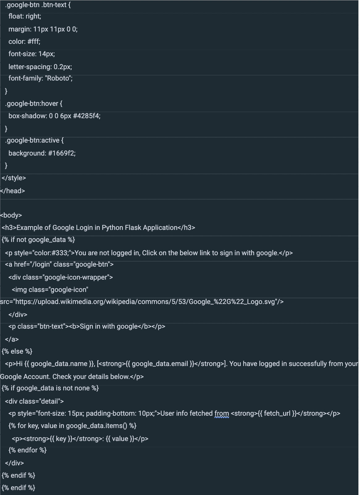 To implement the Google login in your Flask application, follow the steps below. This code was written in Python version 3.9.1.