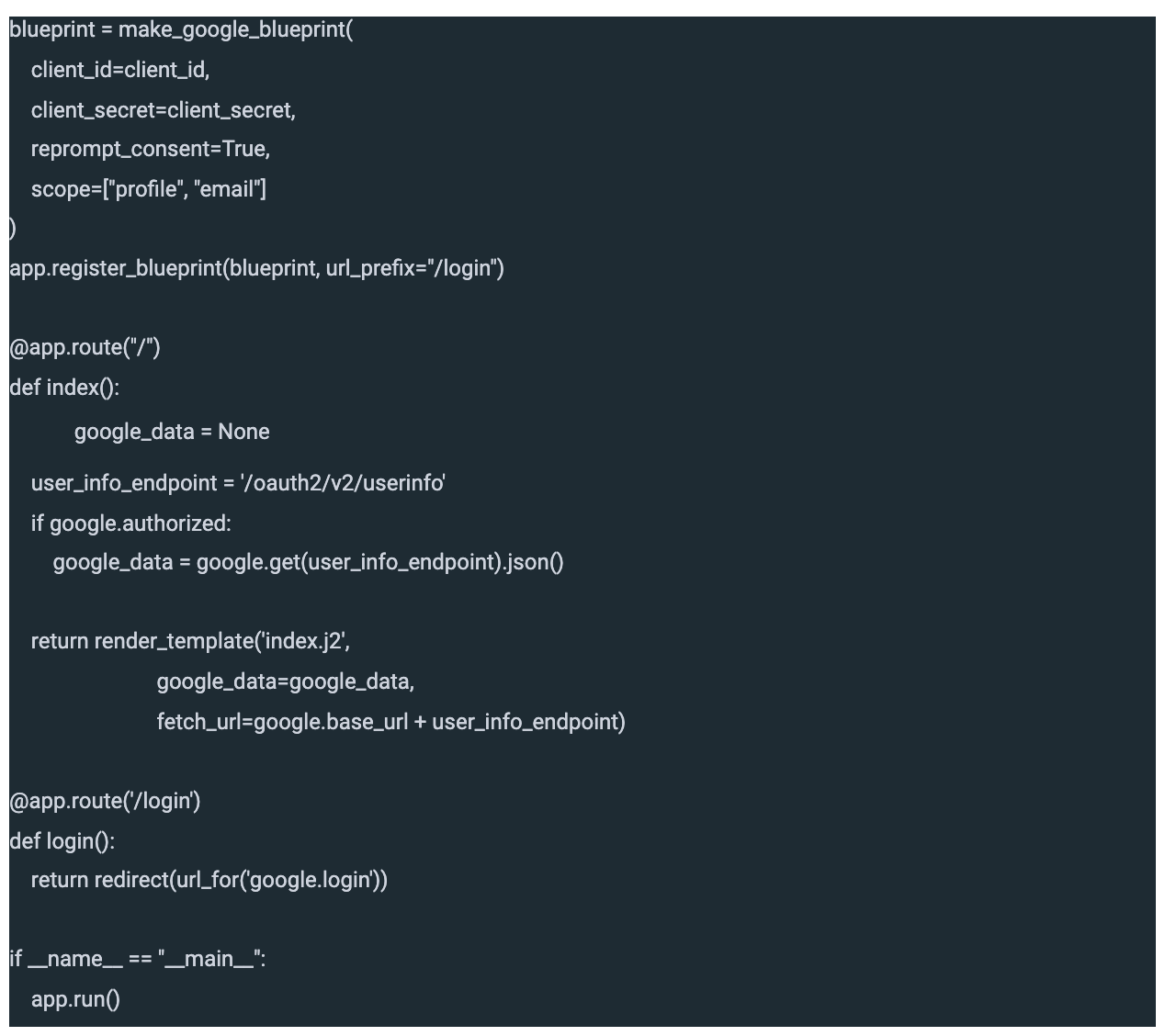 - Add the below code to handle the Google login. Check in the index function if the user is already logged in. Then, pass the user information in the HTML template. Create a login method that will redirect the user to Google’s login page.