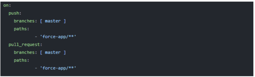 The ‘branches’ tag refers to the branch name on which the workflow should run. We have used the master branch as the reference branch in our case. If you want to ignore specific branches, use ‘branches-ignore’ with the push/pull_request tag.