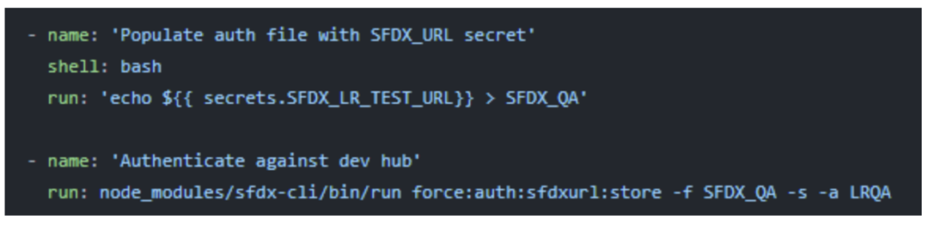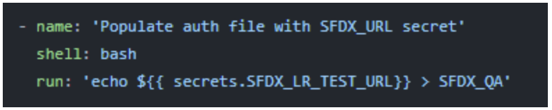 In the image above, I’m first storing the secret into a variable named SFDX_QA and then using the variable to authorize. You can directly use the secret as well.