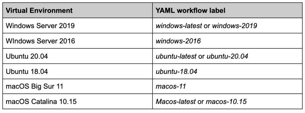 To create an environment for your job to run, use the ‘runs-on’ keyword. The supported environments are listed below.
