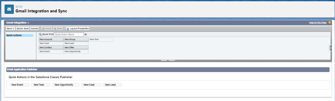 Now add the action to the publisher layout so it’s visible on the main screen. Enter “Gmail Integration and Sync” in the Quick Find box, go to email application publisher and edit it.