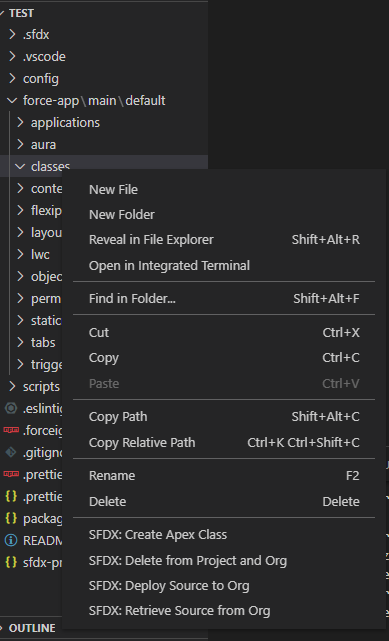 Let’s create an example standard project named “TEST.” To do this, press ctrl+shift+P (on Windows) or command+shift+P (on Mac), and select SFDX: Create Project. Select a project type according to your requirement. In our case, let’s select a standard.