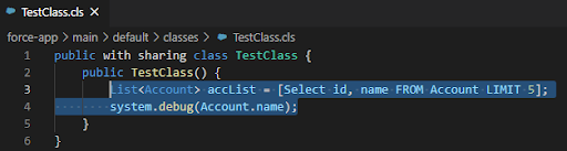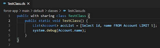 We can also choose any other directory to save the file if you would like. The class will be created with a .cls extension. This is how our Apex class will look: