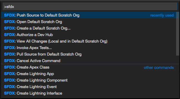 To filter for all the SFDX commands, just enter sfdx in the command palette and you’ll see all the sfdx commands listed like below: