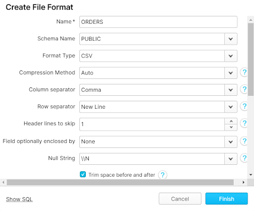 CREATE FILE FORMAT "MAGENTAORDER"."PUBLIC".ORDERS TYPE = 'CSV' COMPRESSION = 'AUTO' FIELD_DELIMITER = ',' RECORD_DELIMITER = '\n' SKIP_HEADER = 1 FIELD_OPTIONALLY_ENCLOSED_BY = 'NONE' TRIM_SPACE = TRUE ERROR_ON_COLUMN_COUNT_MISMATCH = TRUE ESCAPE = 'NONE' ESCAPE_UNENCLOSED_FIELD = '\134' DATE_FORMAT = 'AUTO' TIMESTAMP_FORMAT = 'AUTO' NULL_IF = ('\\N');