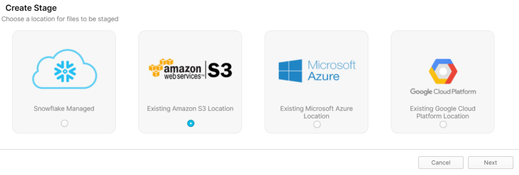 Next, Jake must create a Stage in Snowflake, which is an intermediary space for his data to stay until he uses commands to load it into the table he created. Jake creates an External Stage to reference the data he has stored in AWS (there are also Internal Stages for files that are stored locally in Snowflake). Jake creates the Stage with the Snowflake UI by specifying the URL of his AWS bucket and providing credentials. He includes the entire process and the SQL for us because he’s really a fine fellow.