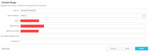 CREATE STAGE "MAGENTAORDER"."PUBLIC".MAGENTAORDERS URL = 's3://awsurl/test/' CREDENTIALS = (AWS_KEY_ID = '[YOUR KEY]' AWS_SECRET_KEY = '[YOUR SECRET KEY');