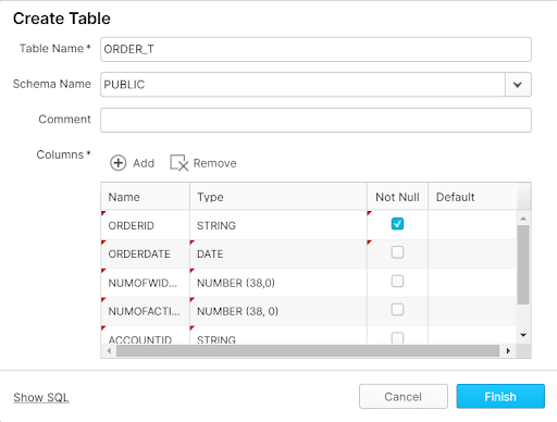 create or replace TABLE ORDER_T (ORDERID VARCHAR(32000) NOT NULL,ORDERDATE DATE,NUMOFWIDGETS NUMBER(38,0),NUMOFACTVITIES NUMBER(38,0),ACCOUNTID VARCHAR(32000),DELIVERYDATE DATE);