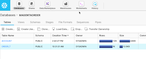 Jake syncs the Account object from Salesforce to the MAGENTAORDER database in Snowflake and schedules a regular run time. He then enters Snowflake to verify that the table has populated.