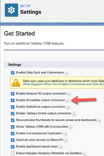 To begin, Jake enters the Analytics Settings in the Salesforce setup and turns on the Snowflake Output Connection.