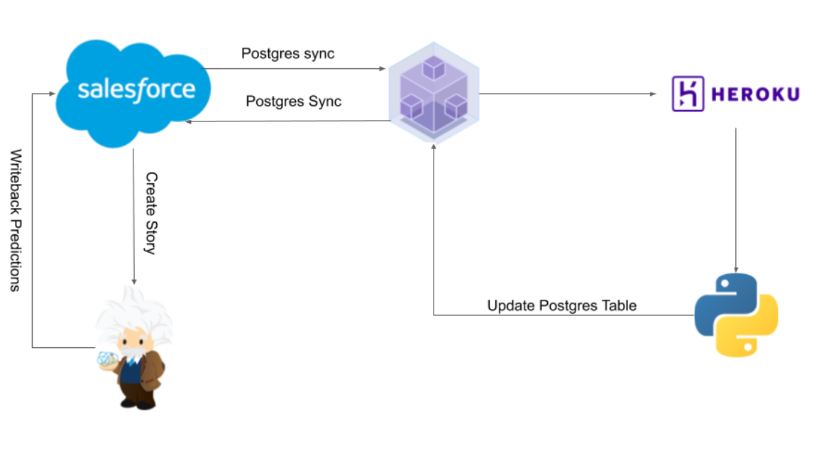 Configure a Postgres database to be used with your Heroku app for the data sync. The sync should be set up as bi-directional for the object you want to write the predictions. This would be the opportunity object.