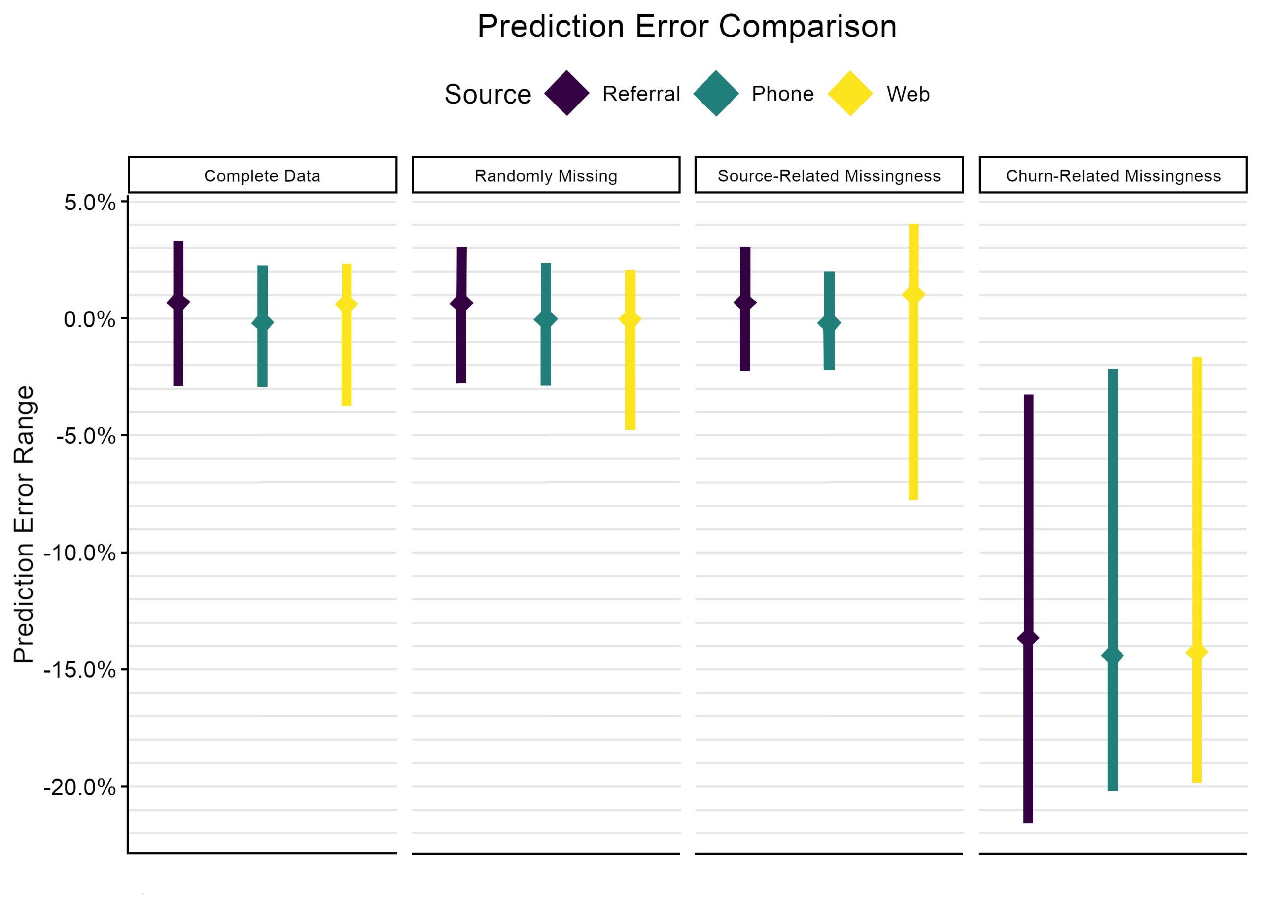 Because we simulated the data and thus know the true churn probabilities, we can examine the prediction error at the level of individual customers. Figure 2 visually summarizes the results in terms of prediction error, showing the range of prediction errors for customers from each source along with the average prediction error per source. For the complete data and randomly missing scenarios, the prediction errors are close to zero, meaning that the propensities are approximately equal to the true probabilities. For source-related missingness, the range of prediction errors for web accounts is much wider, and on average the propensities are overestimates. For churn-related missingness, all sources have wide ranges of prediction error and all propensity scores underestimate the true probability of churn. We further dig into these results and their consequences below.