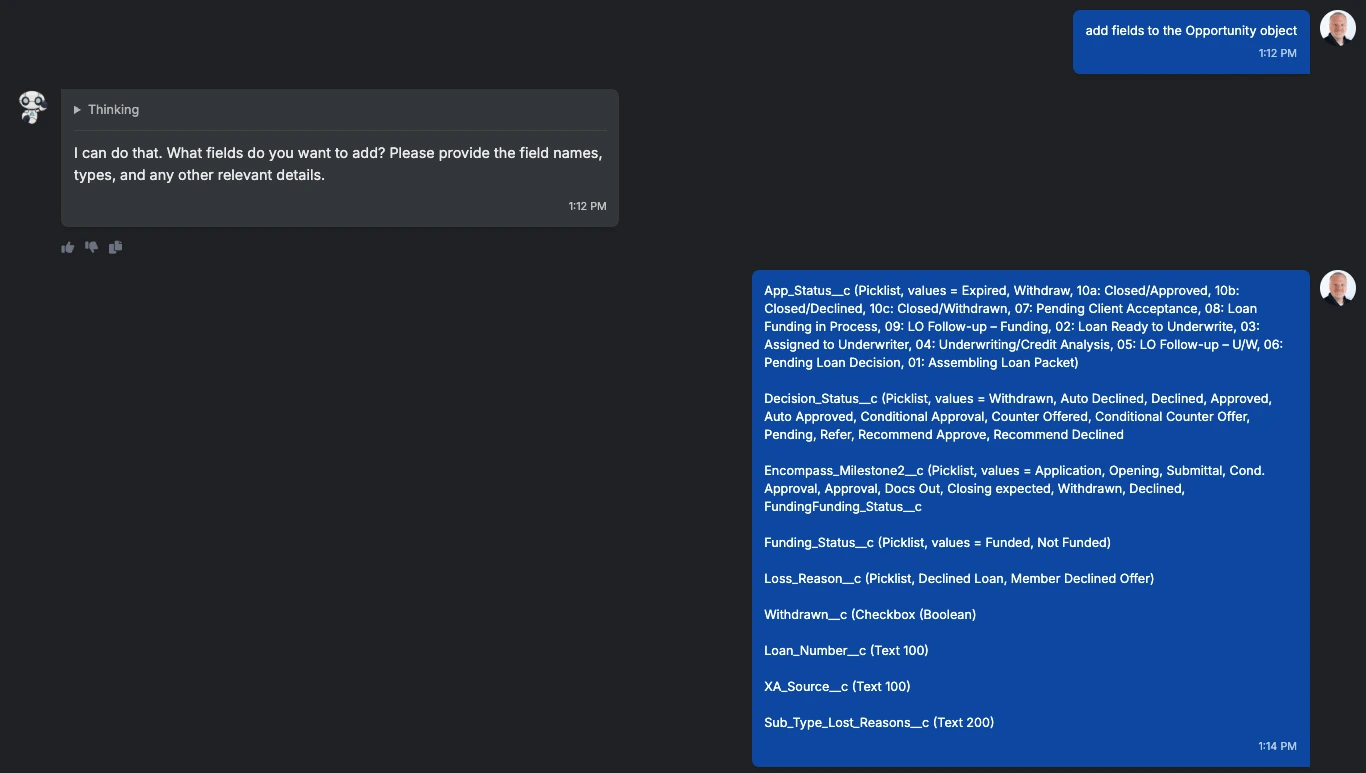“Here’s a user story that references these fields. Can you interpret based on that what data type each field is? For picklist fields, please include the list of values (as many as you can gather from the story below).”