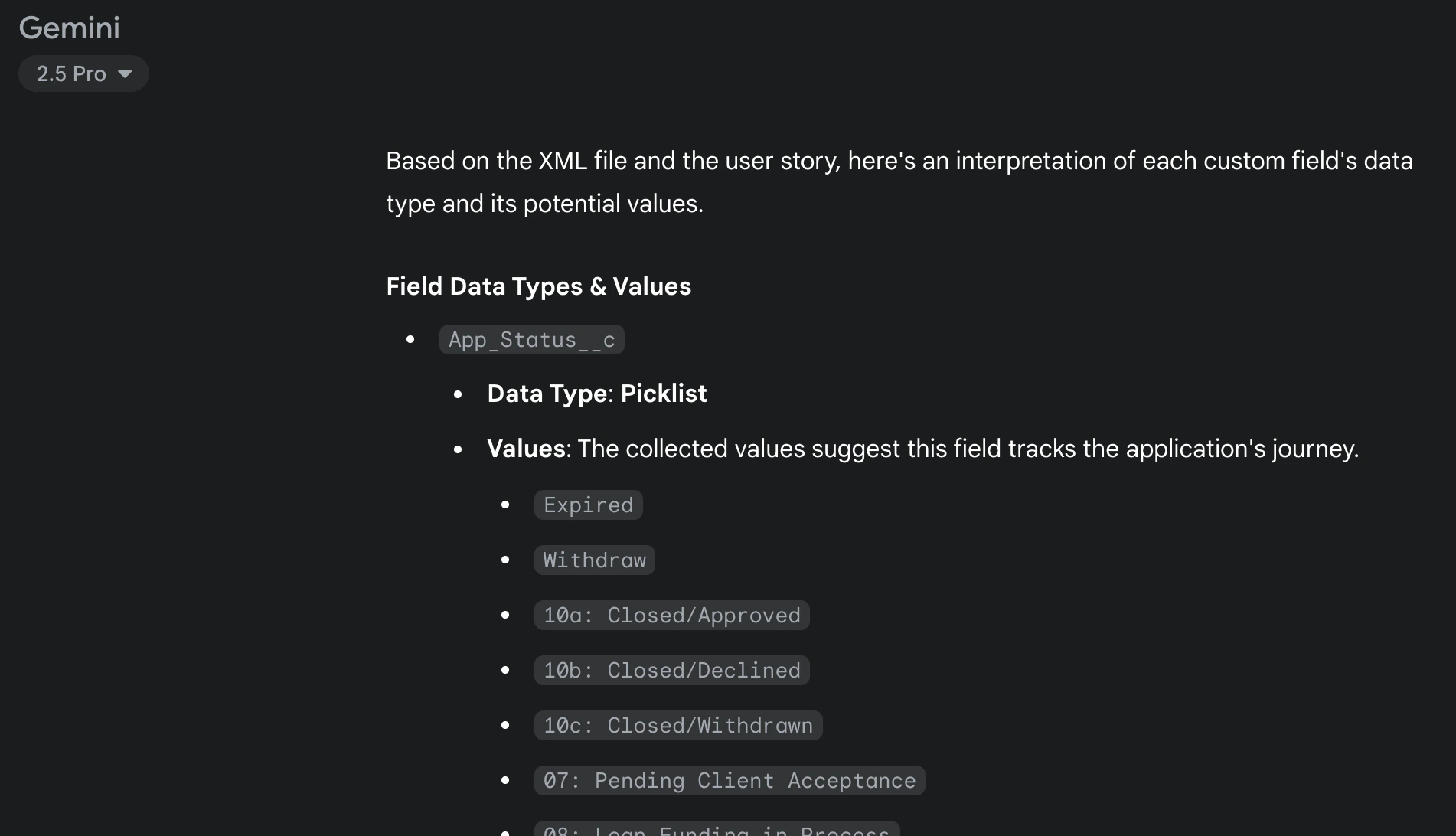 Gemini nailed it, extracting all of the picklist values from both the XML and the user story and correctly identifying the type for all fields: